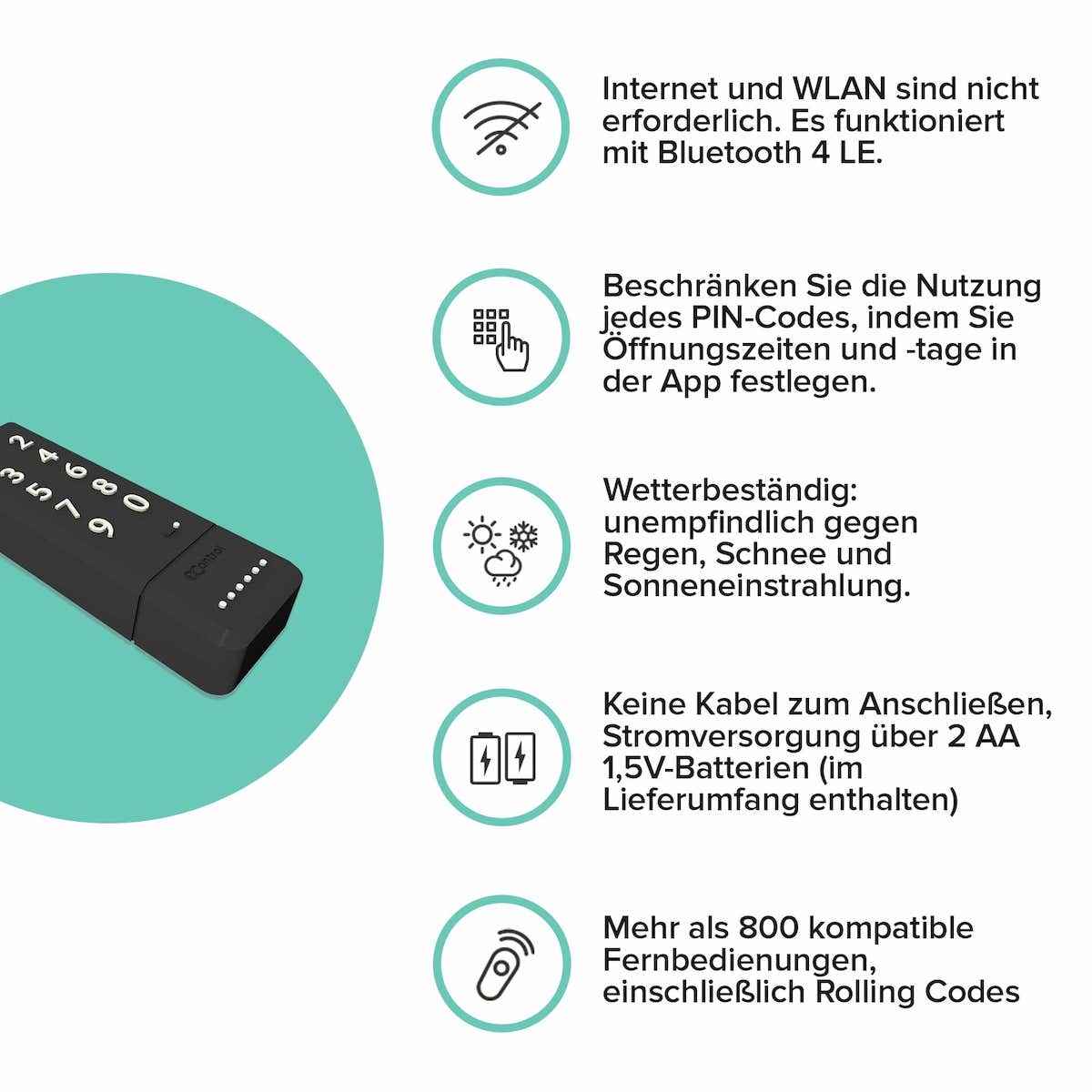 • 4 PIN-Codes inklusive, mit der Möglichkeit, Tage/Uhrzeiten der Nutzung einzustellen