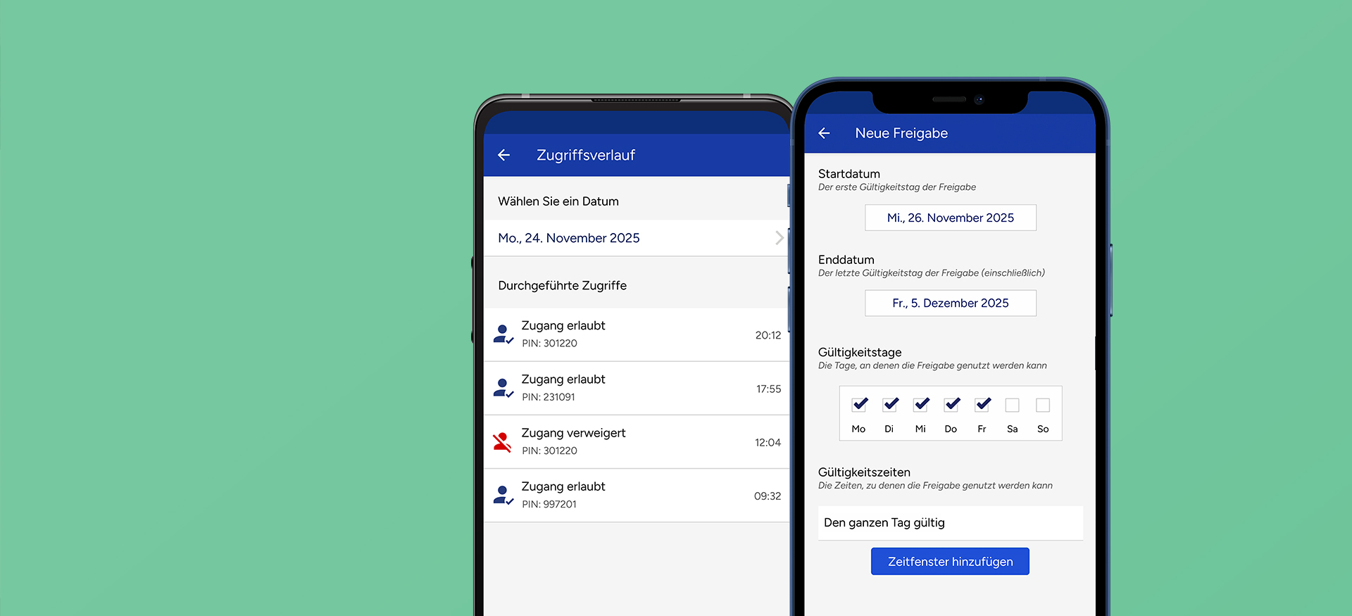 Erhöhen Sie die Sicherheit, indem Sie für jeden PIN Nutzungstage und -zeiten festlegen. In der App entscheiden Sie, wann der Zugang erlaubt ist, um unbefugte oder außerhalb der Zeitfenster liegende Öffnungen zu verhindern. Außerdem können Sie mit der Zugriffshistorie jederzeit kontrollieren, welcher PIN wann einen Zugang durchgeführt hat.