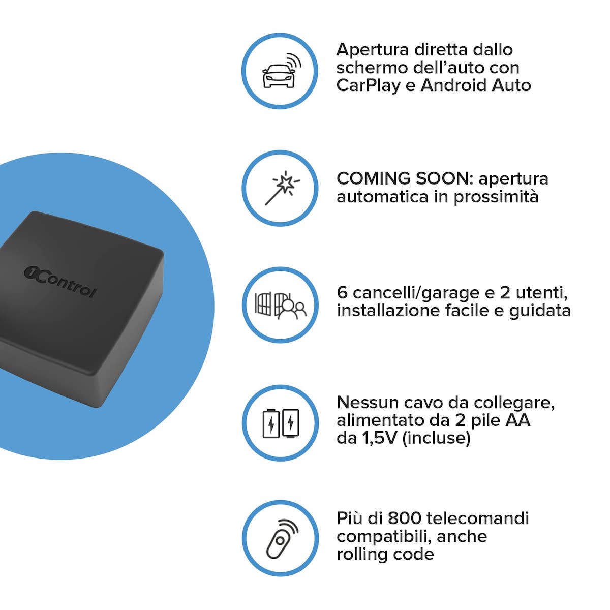 SOLO AUTO è l'unico apricancello al mondo che ti consente di aprire dallo schermo della tua auto con Apple CarPlay e Android Auto, senza necessità di collegare alcun cavo ma semplicemente copiando il tuo telecomando originale con l'app.